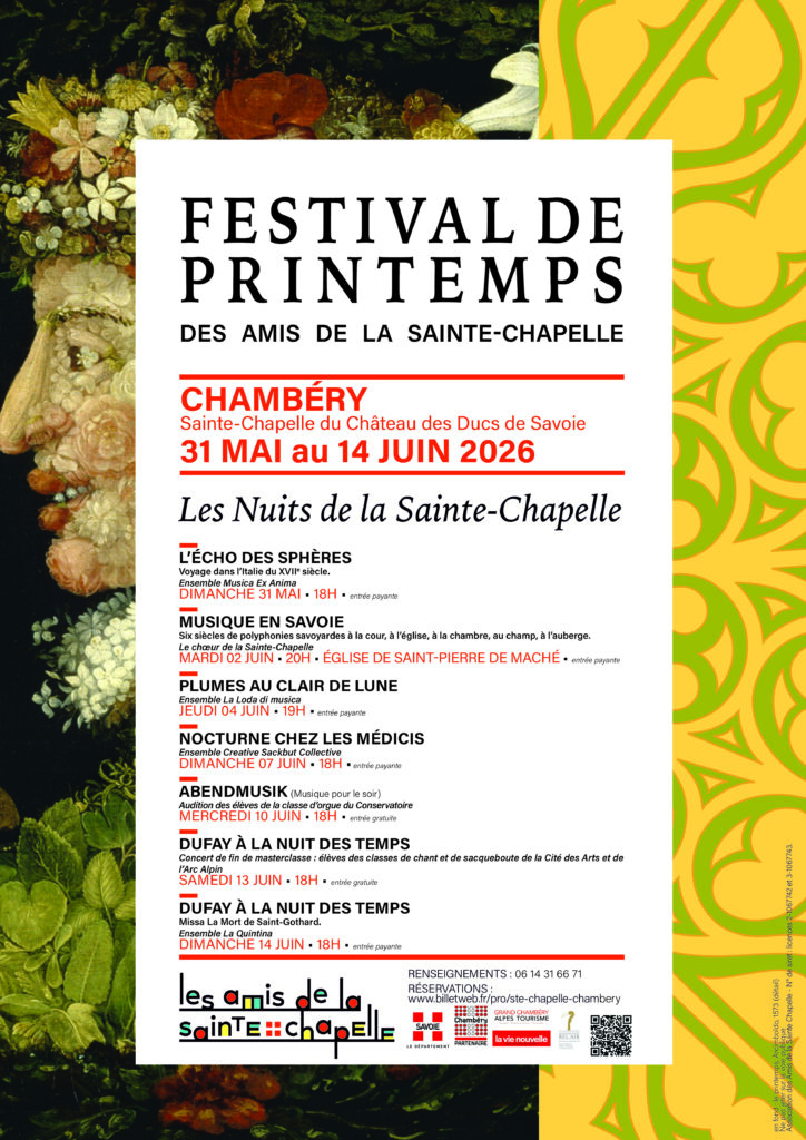 Les Amis de la Sainte-Chapelle vous proposent le prochain festival de printemps du 31 mai au 14 juin 2026 à la Sainte-Chapelle du Château des Ducs de Savoie (entrée par la grille place du château, statue des frères de Maistre), ainsi qu’à l’Église Saint-Pierre de Maché (plans)